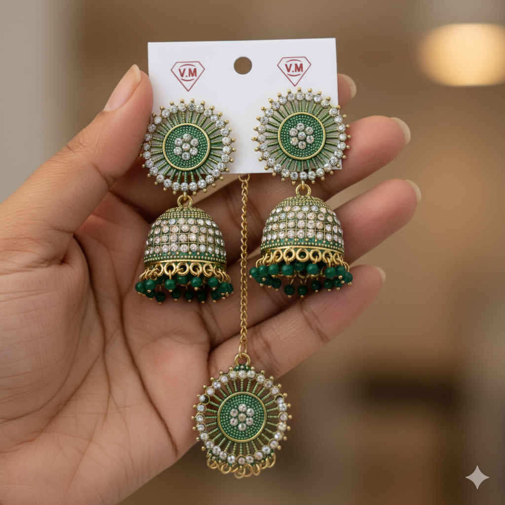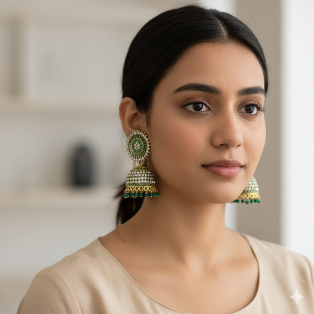 Green Sparkle Jhumka Earrings – Add a touch of elegance to your ethnic look with these beautifully crafted jhumkas. Designed with sparkling green stones and a traditional touch, these earrings are perfect for weddings, parties, and festive occasions. Lightweight yet stylish, they complement sarees, lehengas, and even modern outfits effortlessly. A must-have jewelry piece for every woman’s collection.